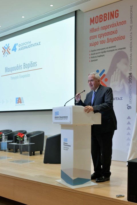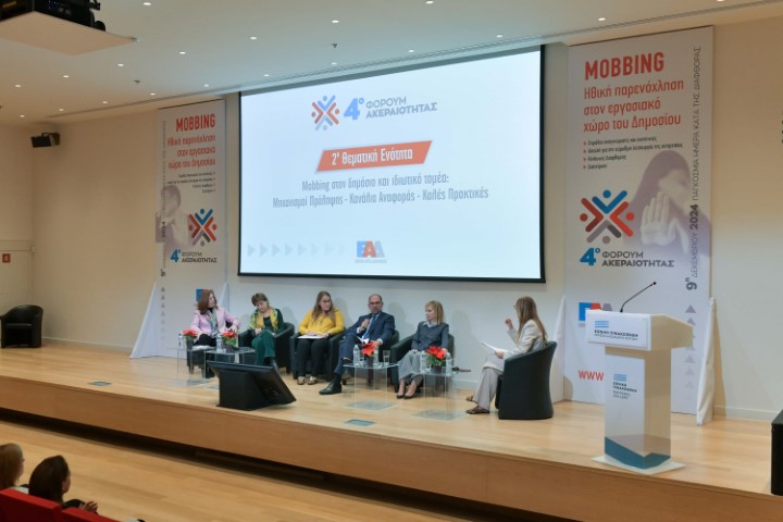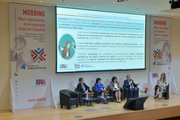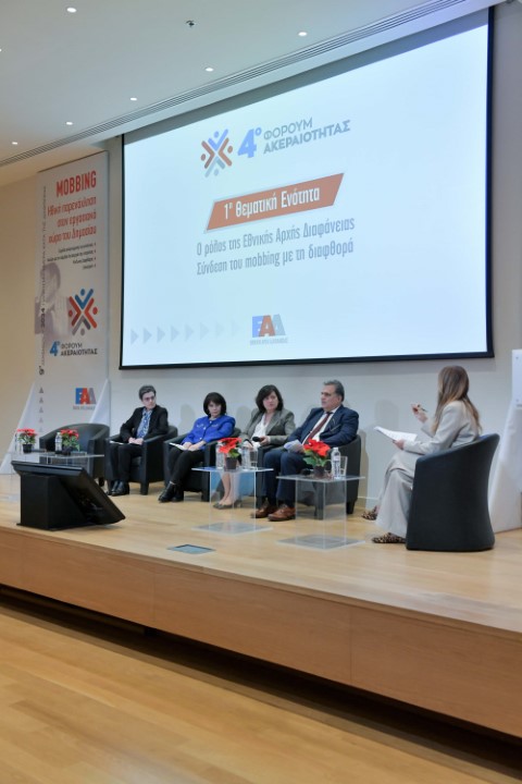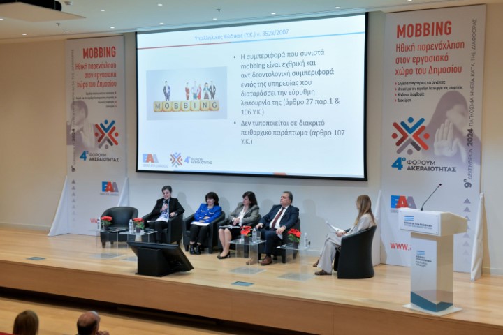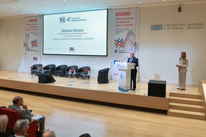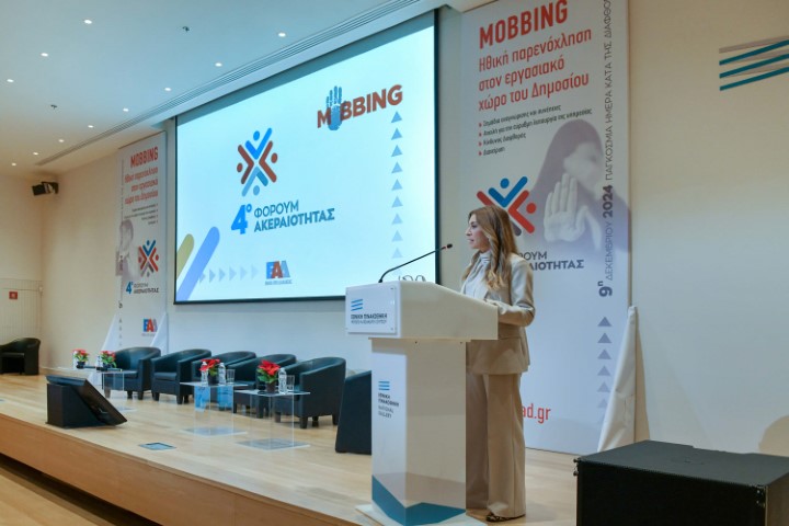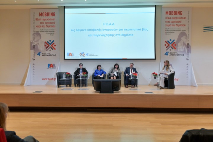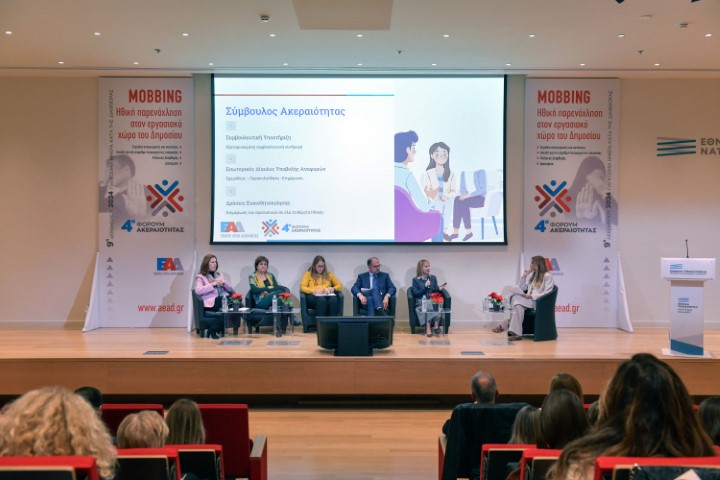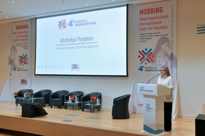 Με αφορμή την Παγκόσμια Ημέρα κατά της Διαφθοράς (9η Δεκεμβρίου), η Εθνική Αρχή Διαφάνειας διοργάνωσε, για τέταρτη συνεχόμενη φορά, το Ετήσιο Φόρουμ Ακεραιότητας (Integrity Forum), με κεντρικό θέμα «Mobbing: Ηθική παρενόχληση στον εργασιακό χώρο του Δημοσίου»: