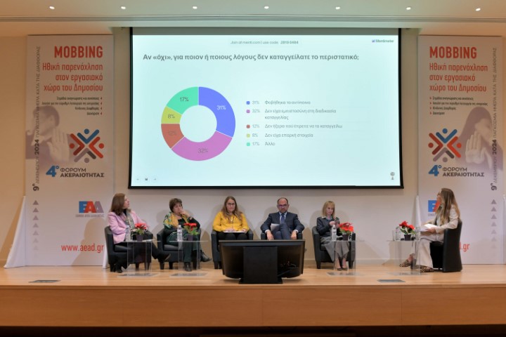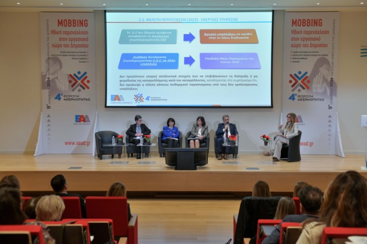 Παράλληλα, παρουσιάστηκε η ειδική πλατφόρμα υποβολής καταγγελιών mobbing( https://aead.gr/kataggelies/mobbing-exete-prosfigei ) που έχει αναπτύξει η ΕΑΔ, ενισχύοντας την προστασία και την υποστήριξη των δημοσίων υπαλλήλων που αντιμετωπίζουν τέτοια φαινόμενα.
