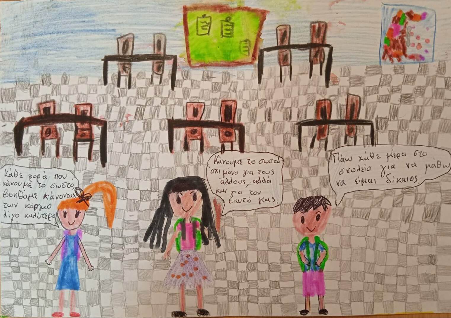 A total of 37 schools from all over the country were represented (Attica, Thessaloniki, Patras, Patras, Sparta, Thebes, Corfu, Corfu, Serres, Lamia, Mytilene, Kavala, Pella, Corinth, Ioannina, Astros, Rhodes and Katerini), whose students had the opportunity to express themselves through creative ways (e.g. The students had the opportunity to express themselves through art forms (e.g. painting, collage, poster, video, written text, poem) and to reflect in an original way the values of respect, justice, integrity and solidarity. The aim of the action was to gradually familiarise the student community with the concepts of ethics, transparency and accountability, as well as with the benefits for society as a whole of strengthening the mechanisms for preventing and deterring phenomena of opacity, corruption and maladministration.