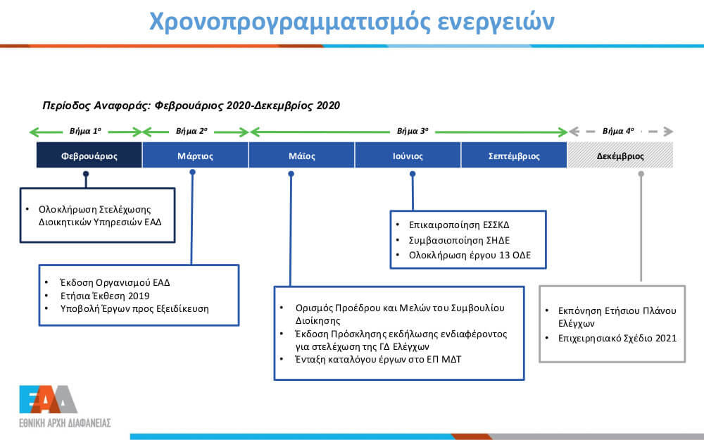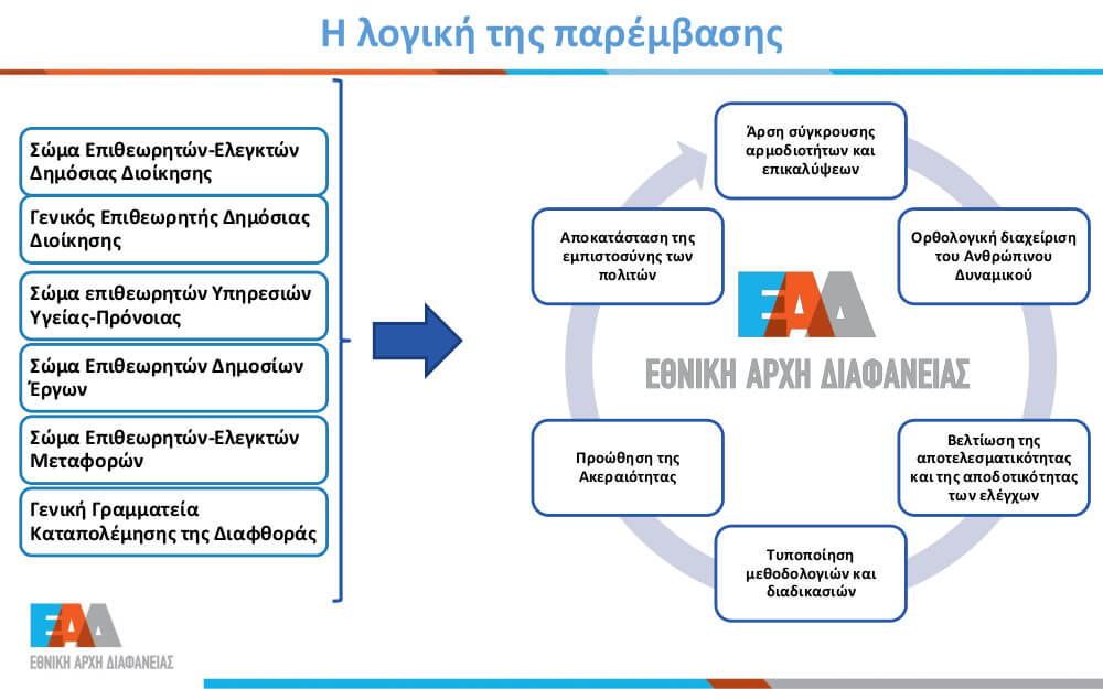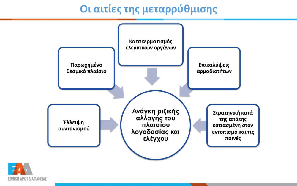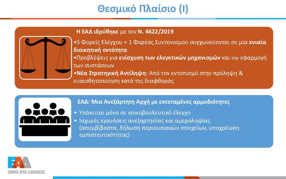 Η Εθνική Αρχή Διαφάνειας ιδρύθηκε με τον νόμο 4622/2019 (Α' 133). Στα άρθρα 82-103 και 118-119 ορίζεται το θεσμικό πλαίσιο της λειτουργίας της. Η Αρχή αναλαμβάνει το σύνολο των αρμοδιοτήτων πέντε βασικών ελεγκτικών δημόσιων φορέων (Γραφείο Γενικού Επιθεωρητή Δημόσιας Διοίκησης, Σώμα Επιθεωρητών-Ελεγκτών Δημόσιας Διοίκησης, Σώμα Επιθεωρητών Υπηρεσιών Υγείας και Πρόνοιας, Σώμα Επιθεωρητών Δημοσίων Έργων, το Σώμα Επιθεωρητών-Ελεγκτών Μεταφορών), καθώς και της Γενικής Γραμματείας Καταπολέμησης της Διαφθοράς.