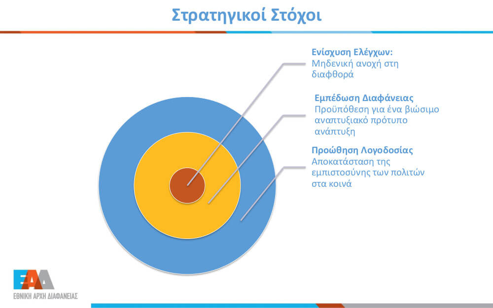 Η Εθνική Αρχή Διαφάνειας φιλοδοξεί να κινητοποιήσει το σύνολο των υγιών δυνάμεων του δημόσιου και του ιδιωτικού τομέα συμπεριλαμβανομένης της κοινωνίας των πολιτών, προκειμένου να σχηματιστεί μία κοινωνική πλειοψηφία που θα απαιτεί αλλά και θα συμμετέχει ενεργά στη δημιουργία προτύπων και μηχανισμών που θα προάγουν τη διαφάνεια, την ακεραιότητα και τη λογοδοσία στο σύνολο της κοινωνίας δημιουργώντας ένα περιβάλλον που δεν θα ευνοεί την ανάπτυξη φαινομένων κακοδιοίκησης και διαφθοράς.