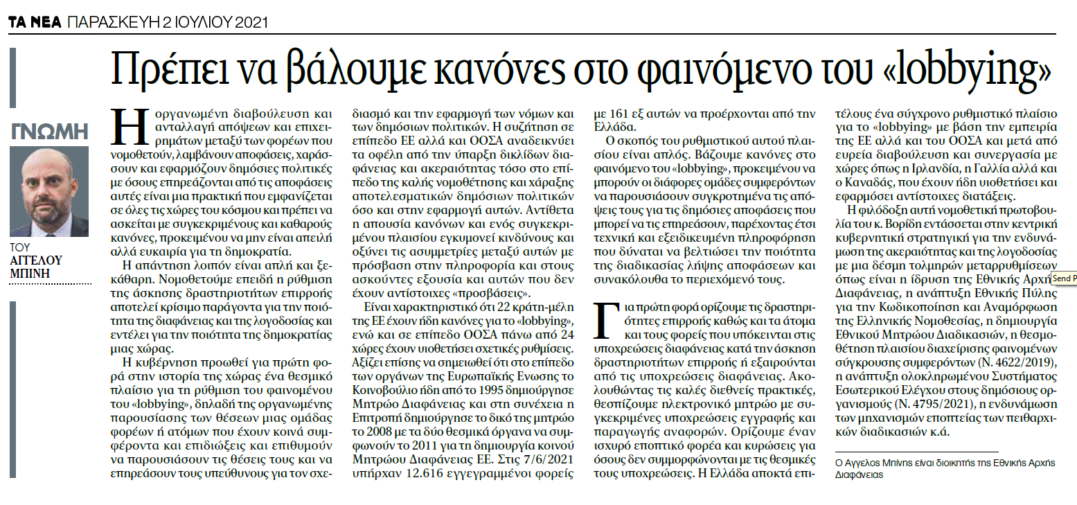 Ο Διοικητής της ΕΑΔ στο άρθρο του που δημοσιεύτηκε στην εφημερίδα τα ΝΕΑ αναλύει τους λόγους για τους οποίους το "lobbying" θα πρέπει να ασκείται με συγκεκριμένους κανόνες, προκειμένου να μην αποτελεί απειλή αλλά ευκαιρία για τη δημοκρατία. Επισημαίνει επίσης το γεγονός ότι για πρώτη φορά στην ιστορία της χώρας προωθείται ένα θεσμικό πλαίσιο για τη ρύθμιση του φαινομένου του "lobbying" με άξονες τη διαφάνεια και τη λογοδοσία.